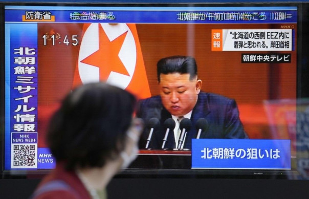 На привокзальном экране в Токио 18 ноября 2022 года показан новостной репортаж о запуске Северной Кореей баллистической ракеты. (Киодо)