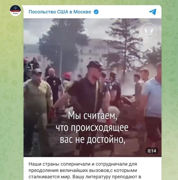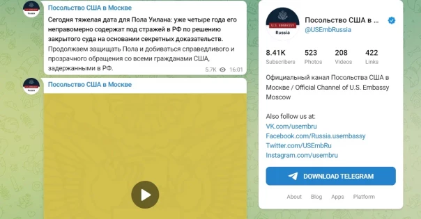 Начнем с того, что их канал называется «Посольство США в Москве». Не в России, а в Москве. Странно. Обычно посольство одной страны отправляется в другую страну, а не просто в ее столицу. Может, они намекают, что их сотрудникам запретили покидать пределы Москвы? Тогда понятно.