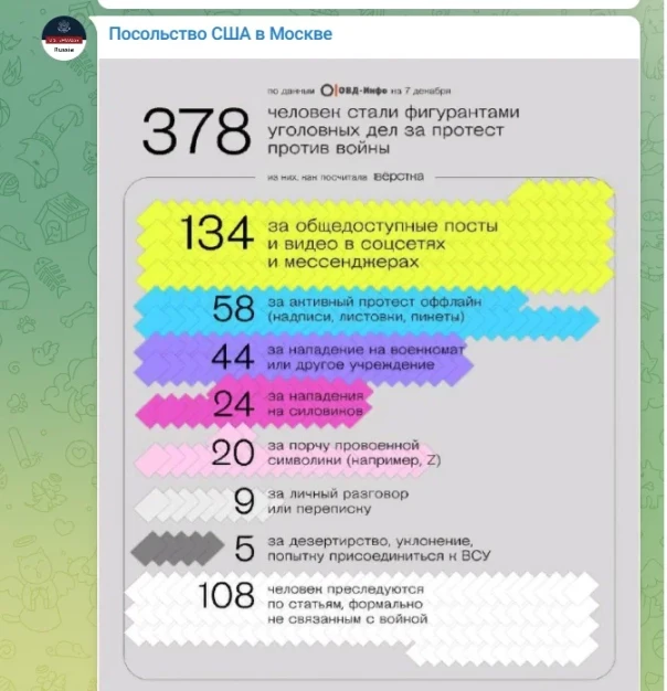 Ужас-ужас! Какие жуткие, по мнению «посольства в Москве» цифры. Посольству и невдомек, что подавляющее большинство россиян скажет, что цифры-то маловаты. Всего 20 дел за порчу символики? А почему так мало? Всего 58 дел за активный протест? Мало!! Где посадки, Владимир Владимирович?