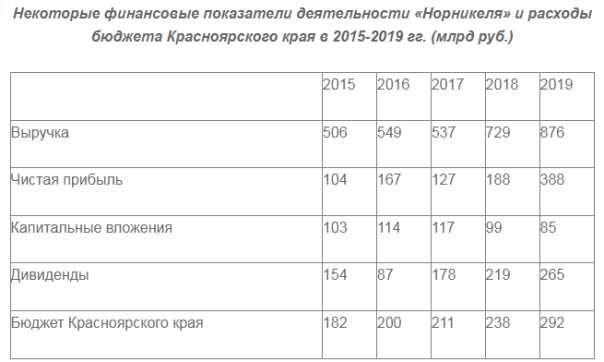 Величина выплачиваемых дивидендов акционерам «Норникеля» существенно превышает объём капитальных вложений в основные фонды предприятия. За пятилетний период суммарный объем выплаченных дивидендов составил 903 млрд руб., а капвложения – 518 млрд руб. Величина дивидендов сопоставима с бюджетом Красноярского края, где проживает без малого 3 миллиона человек, а площадь больше, чем территории многих европейских государств.