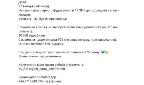 Вполне возможно, что всё это пустая брехня, и полученные от меценатов и инвесторов средства пойдут в карман собирателю. Но почему, например, блогер-иноагент Вероника Белоцерковская за клевету на военные силы России лишилась 153 миллионов (имущество Белоцерковской на эту сумму заморожено в РФ) — и буквально через две недели озаботилась тем, что Украине «очень нужны медикаменты», а значит, пора давать ужины за 10 000 евро?