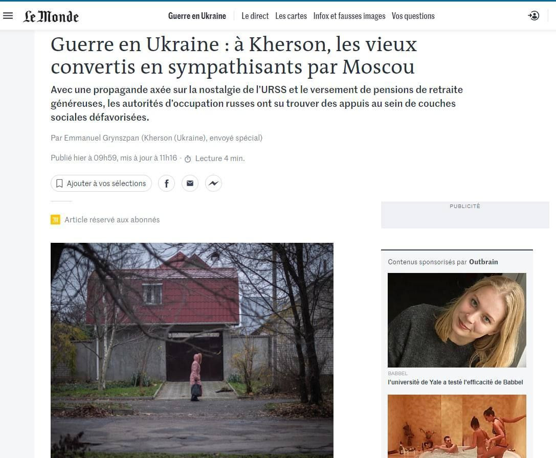 Солдат украинской теробороны подтверждает, что, когда в городе были русские, за российскими паспортами и гуманитарной помощью стояли очереди. И он тут же обвиняет херсонцев старших поколений в «продажности»: они, оказывается, соглашались получать российские пенсии, а кто-то охотно пошёл к «русским оккупантам» на работу. Впрочем, французское издание даёт возможность понять, в чём действительная причина такого поведения: «Русские, когда пришли в Херсон, сразу же включили свои телеканалы. Я услышала советский, ой... российский гимн, он такой же, только с другим текстом… И я плакала от радости!.. Когда я все это услышала, у меня защемило сердце», – сказала в разговоре с французскими журналистами ещё одна женщина, жительница Херсона, объяснившая, что общая история с Россией – это её молодость.