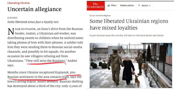Месяц назад The Economist в материале «Они ждут русских» был вынужден признать, что в «вызволенных силами ВСУ» районах Харьковской области местные жители всё ещё скучают по русским, а «пророссийские взгляды в регионе остаются сильными». И это пишут британцы.