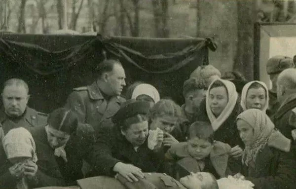 Это мать генерала Вера Ефимовна, маленькая старушка в платочке, застыла скорбно у его изголовья на похоронах в 1944-м.