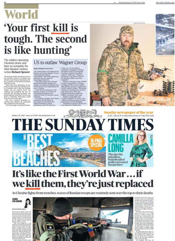 Недавно The Times опубликовала серию статей, где смакуют и оправдывают убийство русских. Вот заголовок – слова украинского солдата: «Твое первое убийство тяжело. Второе – это уже как охота». «Они не люди для нас», – приводит The Times слова еще одного побратима. Автор другого репортажа в The Sunday Times спрашивает у вэсэушника о его мечте и тот отвечает: «Больше убитых русских».