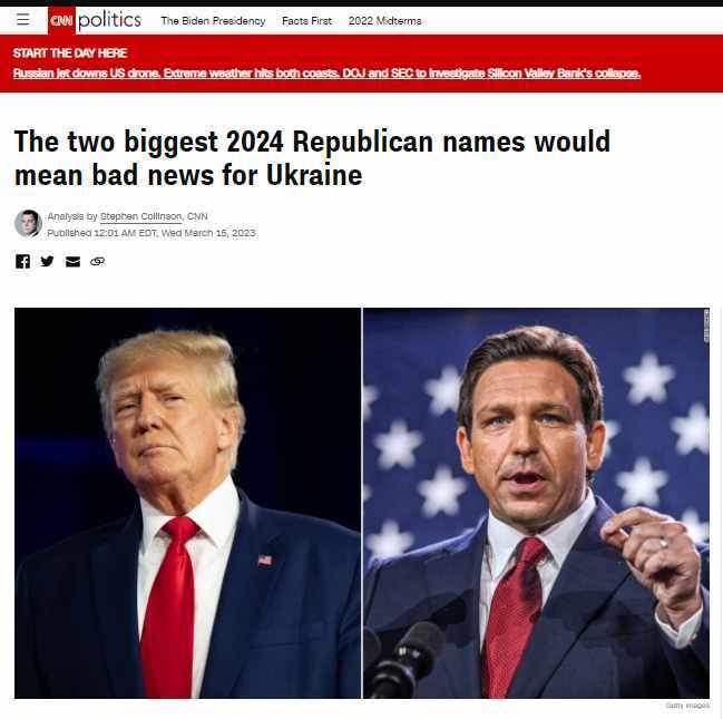 «Предупреждения Трампа о том, что только он может остановить Третью мировую войну, и главный аргумент ДеСантиса о том, что спасение Украины не является основным интересом национальной безопасности США, скорее всего, получат еще большую поддержку после одного из самых тревожных моментов войны во вторник. Очевидное сбитие американского беспилотника российским истребителем над Черным морем стало на шаг ближе к сценарию, которого все боялись с тех пор, как год назад разразилась война, — прямому столкновению между американскими и российскими войсками. Новый опрос CNN/SSRS, проведенный во вторник, например, показал, что 80% республиканцев или сторонников республиканцев считают важным, чтобы кандидат Республиканской партии на пост президента считал, что США «не должны быть вовлечены в войну между Россией и Украиной».