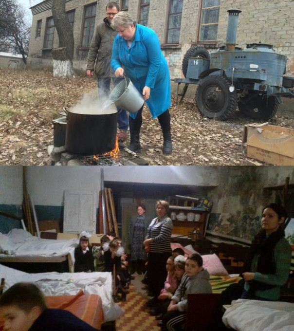 На фото – приготовление обеда во дворе интерната и пережидание бомбардировок ВСУ в подвале осенью - зимой 2014 года. Источник