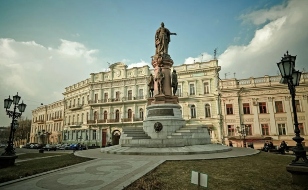 Памятник основательнице Одессы российской императрице Екатерине Второй и ее сподвижникам – де Рибасу, де Волану, Потемкину и Зубову. Ныне снесен бандеровцами в целях стирания исторической памяти