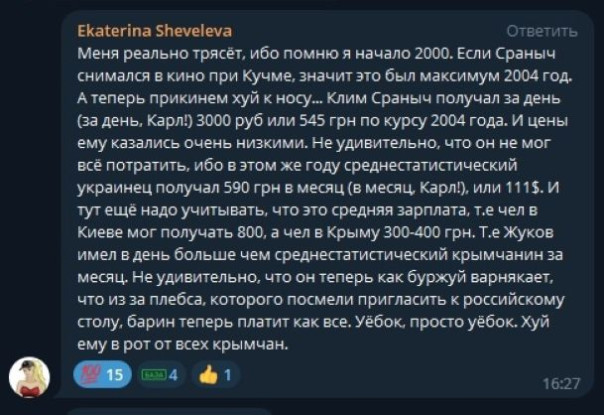 Раньше я при Кучме снимался, например в Крыму в кино и нам там платили какие-то безумные деньги 3 000 рублей в день. Я не знал куда их потратить, потому что там цены были относительно 3 000 наших отечественных рублей настолько никакие.