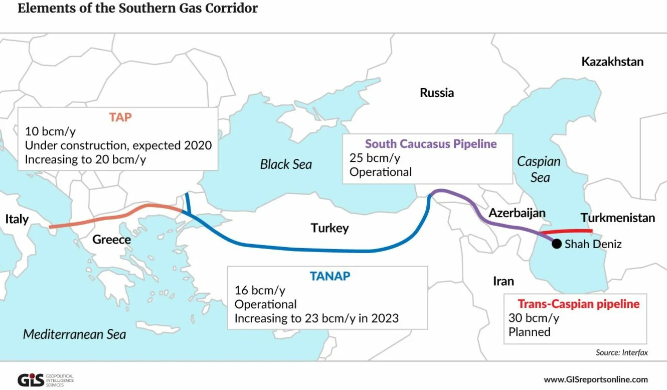 Как свидетельствует опыт Баку при формировании ЮГК, Азербайджану пришлось стать основным инвестором. Южный газовый коридор включает газопровод Баку – Тбилиси – Эрзерум, турецкий Трансанатолийский газопровод (TANAP) и Трансадриатический газопровод с направлением в Южную Европу. И по всем этим трубам идёт азербайджанский газ, но его объёмы имеют предел.