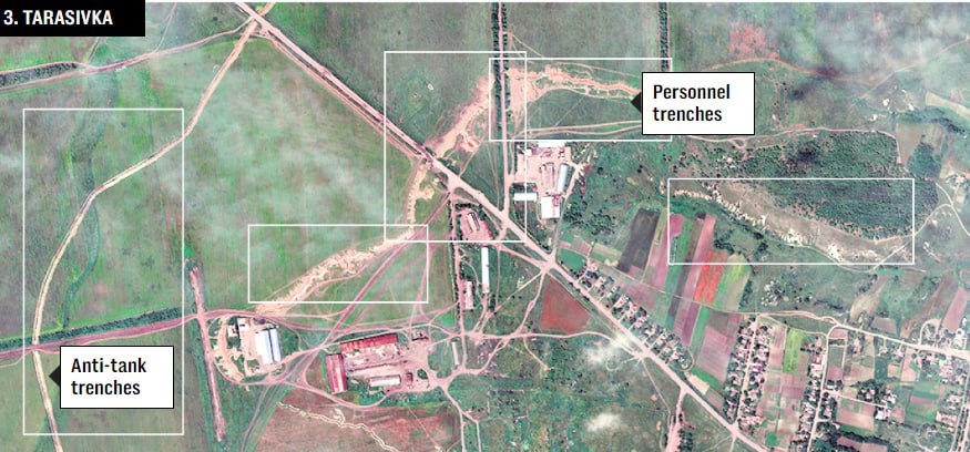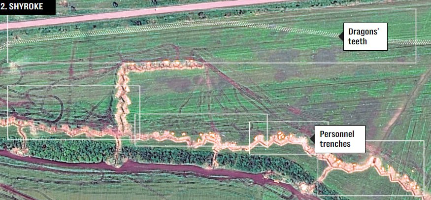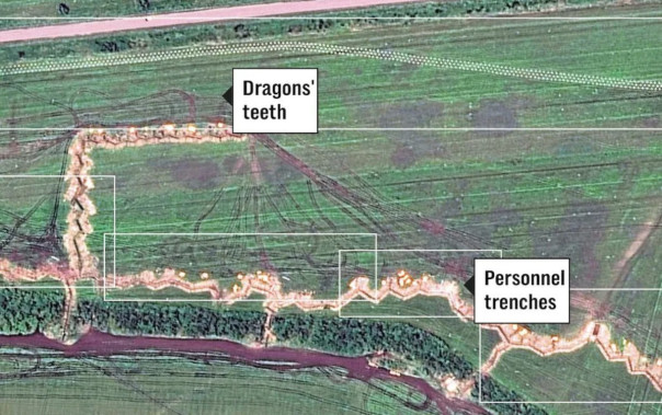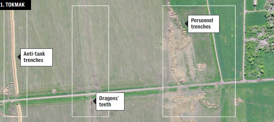 На новых спутниковых снимках видно сложную сеть российской обороны, которую выстраивали последние полгода: множество минных полей, противотанковых рвов и траншей, длина которых по некоторым направлениям может превышать 30 км.