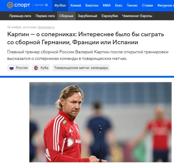 «Главный тренер сборной России Валерий Карпин после открытой тренировки высказался о соперниках команды в товарищеских матчах.