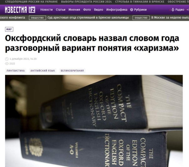 А вот еще фокус-покус из той же импортной серии. «Издательство Оксфордского университета, выпускающее наиболее авторитетный словарь английского языка, признало словом 2023 года разговорное выражение “rizz”, обозначающее персональные шарм и привлекательность».