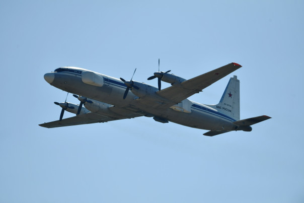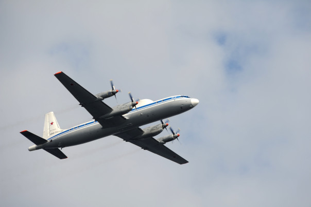 Ил-18 ВМФ России во время праздничного парада в День Военно-морского флота на главной базе Северного флота в Североморске, июль 2014 года