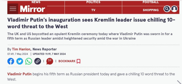 Это просто шедевр, уважаемые! Сайт британской газеты Daily Mirror так преподнес новость об инаугурации Владимира Путина: «Кремлевский лидер выступил с пугающей угрозой в адрес Запада, состоящей из 10 слов». И знаете, что это за страшные 10 слов? Цитирую дословно: «The destiny of Russia will be determined by ourselves only!» («Россия сама и только сама будет определять свою судьбу!»).