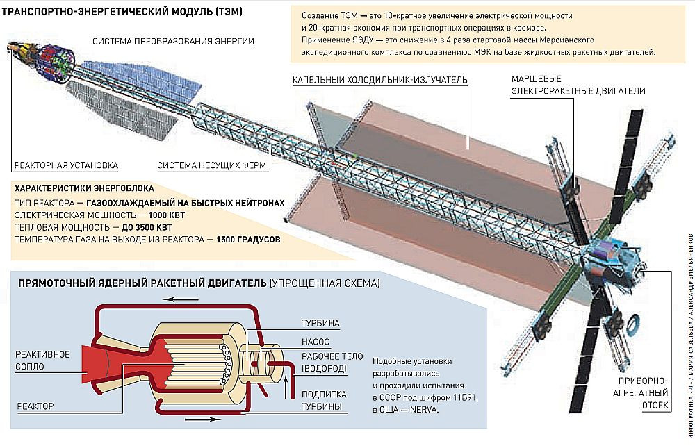 Рабочее тело, циркулирующее в реакторе, нагревается до температуры 1500 градусов по Кельвину и вращает турбогенератор, который вырабатывает электричество для ЭРД, имеющего удельный импульс примерно в 20 раз выше, чем традиционные реактивные двигатели. При этом энергоблок работает по замкнутому циклу – радиоактивные вещества не попадают в окружающее пространство.