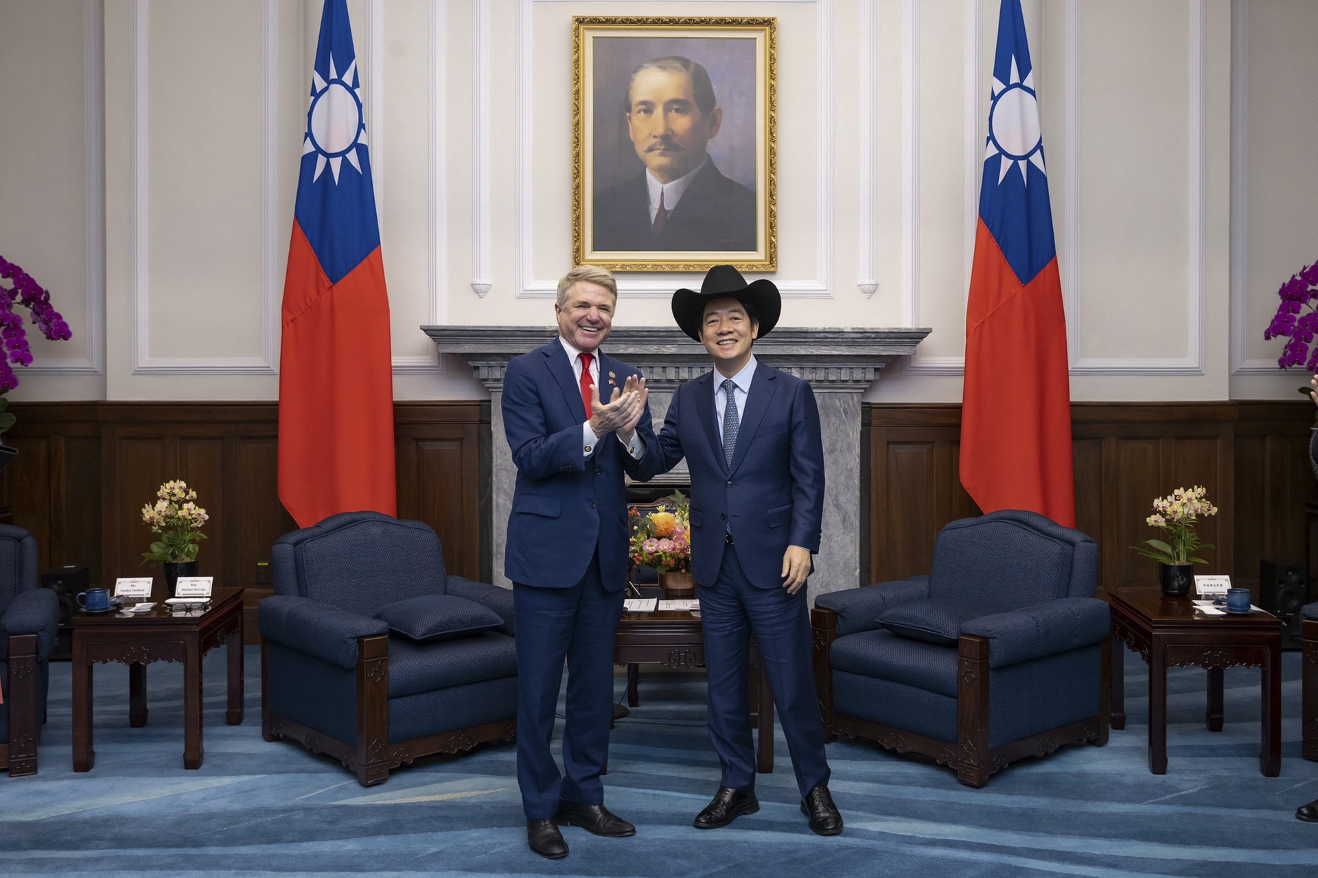 Председатель комитета по иностранным делам палаты представителей конгресса США Майкл Маккол с главой администрации Тайваня Лай Циндэ в Тайбэе