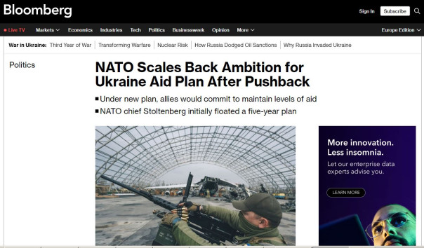 «Йенс Столтенберг столкнулся с сопротивлением членов НАТО после того, как озвучил идею о создании фонда помощи Украине на €100 млрд в следующие пять лет. По информации источников агентства, генсек отказался от этой инициативы и вместо этого предложит странам сохранить текущий уровень поддержки Киева, который с начала военного конфликта составлял около $43 млрд в год.