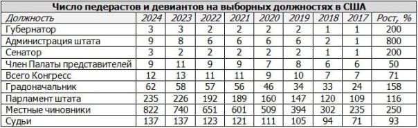 В настоящее время нетрадиционная публика занимает в Америке1303 избираемых поста (0,25%), это только те, кто открыто заявил о своём отклонении в сексуальной идентичности. Рост по сравнению с прошлым годом составил 10%, а с 2017 года – 191%, или почти в три раза.