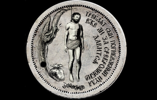 Тогда Петр I приказал изготовить в единственном экземпляре уникальный «Орден Иуды», которым был символически «награждён» Мазепа. Орден Иуды – это большой серебряный круг массой более 5 кг с изображением висящего на осине Иуды Искариота. В нижней части ордена было изображено 30 сребреников и написано: