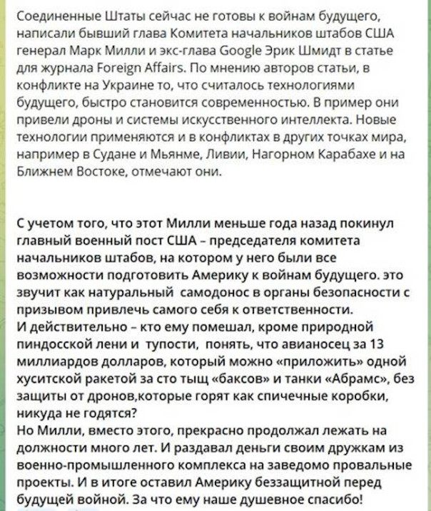 Между тем впечатление или хотя бы иллюзия «слабости России» настолько важна для Запада в данный момент, что он может не устоять перед этим соблазном и ввести в бой свои свежие силы. Пусть даже под эфемерным прикрытием. Вот они и пытаются создать эту иллюзию всеми имеющимися силами. В чем им, кстати, без устали помогают некоторые весьма специфические «местные» телеграм-каналы, которые нагнетают ситуацию похлеще чем киевское ЦИПСО. Если это вообще не одно и то же. Вот так, например: