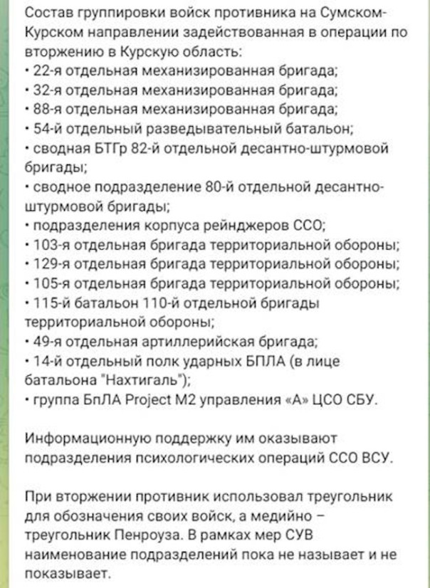 «Касательно распространяемой информации о составе группировки противника на Курском направлении, куда записали аж сразу 4 мехбригады, 3 бригады теробороны, пару десантно-штурмовых бригад ВСУ и еще на сдачу несколько отдельных батальонов и сводных частей. Следует понимать, что если какие-то из данных соединений ВСУ действительно и действуют на территории Курской области и в ее приграничье, то отправлены они туда не целиком. Совокупный состав такой монструозной группировки, действуй она в полном составе, оценивается в десятки тысяч человек личного состава и тысячи единиц тяжелой техники. Такая армада уж точно не топталась бы третьи сутки возле Суджи и Коренево, пытаясь выйти ко Льгову окрестными селами, учитывая практически полное отсутствие обороны ВС РФ на данном направлении. Уже не говоря про то, что на всего паре подконтрольны противнику сейчас второстепенных дорог должны были уже выстроиться многокилометровые пробки из танков, бронетранспортеров, грузовиков и прочего. Одним словом — при задействовании озвученных сил успехи противника были бы гораздо больше, а перемещение войск имело бы характер длинных колонны на всех имеющихся путях сообщения. Таким образом, противник ввел на территорию Курской области хотя и серьезные, но ограниченные силы. Действует ВСУ не армейским корпусом с полноценными бригадами из десятков тысяч солдат, а отдельными формированиями этих бригад. Поэтому когда видите где-то упоминание целой бригады, например 22-й или 88-й ОМБр ВСУ, то держите в уме, что не обязательно там воюет вся бригада целиком».