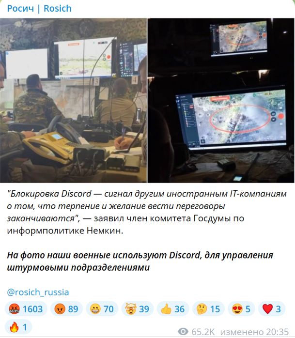 «Возможно нехотя, но очередным таким решением безусловно нанесен своего рода подрыв боевой готовности в некоторых подразделениях. Если брать личный фактор, то работа через Discord не вызывало у нас чувства полной безопасности по понятным причинам. Сказать можно то, что возможность вести трансляцию им не ограничивается и есть другие способы передать изображение с пульта оператора на командный пункт, к тому же сделать это в более безопасном варианте. Дело в том, что был простой и незамысловатый способ вести трансляцию, а желания заморачиваться и искать альтернативы были лишь у единиц. А ведь эти альтернативы есть и лично нами они наблюдались. Спустя какое-то время всё вернется на круги своя, только подрыв в некоторых соединениях был нанесен сегодня, но это уже совсем другая история», — говорится в сообщении. Источник