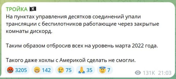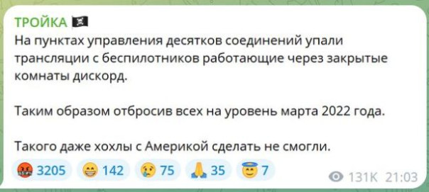 «На пунктах управления десятков соединений упали трансляции с беспилотников работающие через закрытые комнаты Дискорд. Таким образом отбросив всех на уровень марта 2022 года. Такого даже хохлы с Америкой сделать не смогли», — отметили авторы телеграм-канала «Тройка».