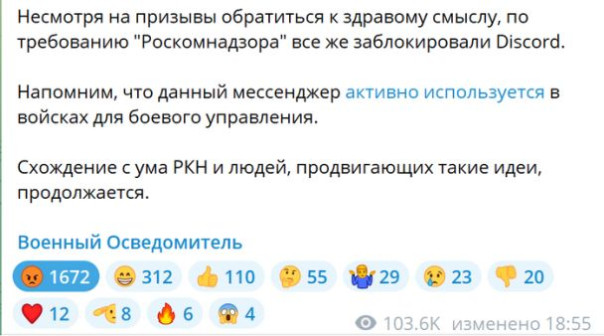 Между тем блокировка меседжера вызвала недовольство ряда блогеров в Телеграме, поскольку Discord помогал участникам СВО в выполнении их боевых задач. Авторы телеграм-канала «Военный Осведомитель» отметили, что мессенджер активно используется в войсках для боевого управления. «Схождение с ума Роскомнадзора и людей, продвигающих такие идеи, продолжается», — говорится в сообщении.