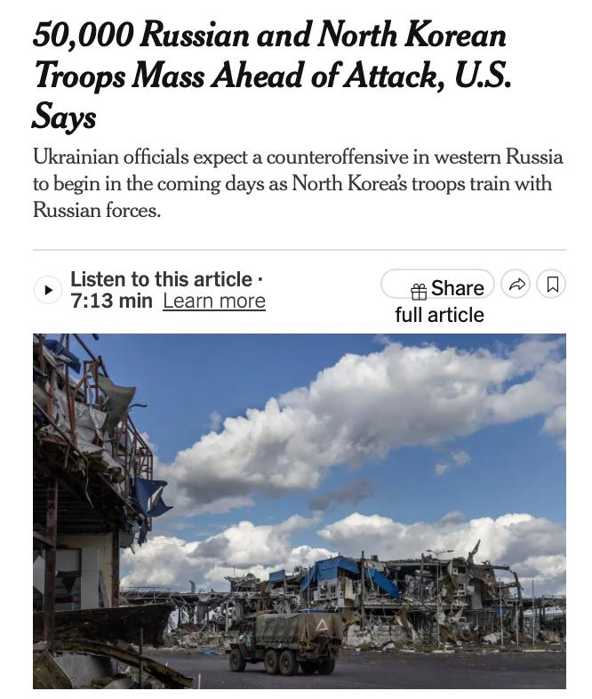 Украинские чиновники говорят, что ожидают наступления с участием северокорейских войск в ближайшие дни. На данный момент войска КНДР проходят боевое слаживание с российскими в западной части Курской области.
