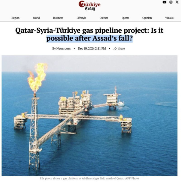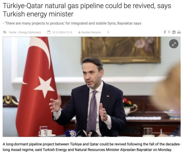 После падения многолетнего режима Асада давно замороженный проект трубопровода между Турцией и Катаром через Саудовскую Аравию, Иорданию и Сирию, может быть возобновлён, если в Сирии будет территориальная целостность и стабильность, и «мы надеемся, что так и произойдёт», заявил на днях министр энергетики и природных ресурсов Турции Альпарслан Байрактар. Вполне логично, что тесно связанное с Анкарой правительство «новой» Сирии в должной мере прислушается к мнению старших товарищей.