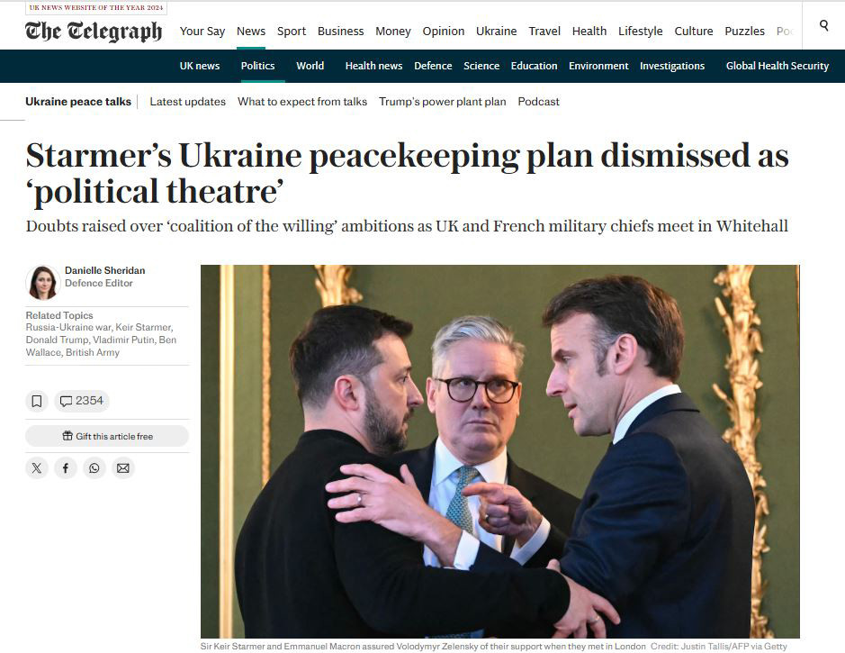 А британское издание The Telegraph сообщает: заявления премьера Стармера об отправке миротворческого контингента на Украину не понравилось британским военным, которые назвали суету Стармера и Макрона «политическим театром».