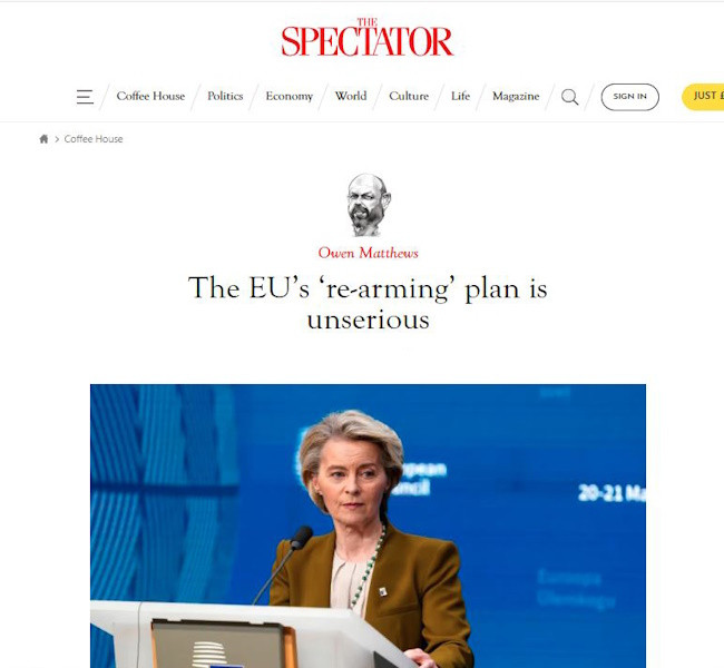 «Европа делает ставку на защиту Украины и себя. С этой целью президент Европейской комиссии Урсула фон дер Ляйен на прошлой неделе объявила о плане ReArm Europe, требующий выделения до 800 миллиардов евро в оборонный сектор в течение следующих четырёх лет. Через несколько дней поняв, что названная сумма нереальна, Ляйен объявила другую – 150 млрд евро. Однако оказалось, что и её негде взять. Тогда решили хотя бы обсудить вооружение Украины, но и тут что-то пошло не так. Первоначально названную сумму в 40 миллиардов евро представители стран Евросоюза не стали даже обсуждать. Тогда была названа другая сумма, более реальная, 5 млрд евро. Но и её не получилось согласовать. По итогу, Украине ничего не выделили и пообещали Зеленскому моральную поддержку. Тогда как ряд стран честно заявили, что не собираются принимать участия в этом мероприятии по вооружению Украины», – пишет автор статьи известный британский обозреватель Оуэн Мэтьюз (Owen Matthews).