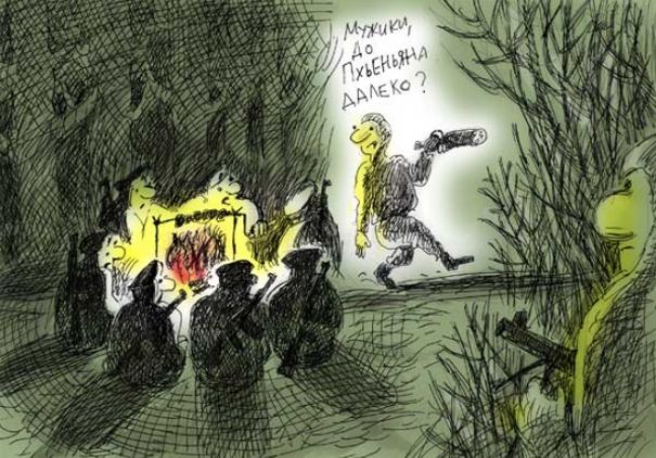 Двинулся дальше. Никто внимания на колонну лётчиков не обратил. Тут наверняка за день таких колонн проезжало по несколько штук. На выезде из деревни, сбоку от дороги стояла лагерная палатка и столб с табличкой "комендантский пост Ответственный прапорщик Жигайло". Чуть подальше, на съезде с дороги, виднелся шлагбаум и одиозная фигура в тулупе и с автоматом.