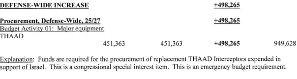 Однако те цифры — еще ничего себе, для разогрева. Кроме всего прочего, этот документ предусматривает выделение 498 265 000 долларов на замену неустановленного количества противоракетных комплексов Terminal High Altitude Area Defense (THAAD), использованных для защиты Израиля, без какого-либо прямого упоминания о «Полуночном ударе».