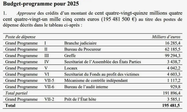 Основываясь на внутренних документах МУС, касающихся его бухгалтерской отчетности, мы можем констатировать, что его бюджет только на 2025 год составляет 195 481 500 евро (резолюция ICC-ASP/23/Res.6, Часть I, §А).