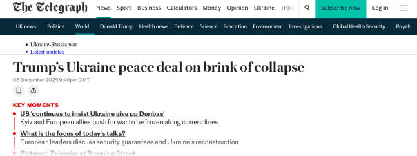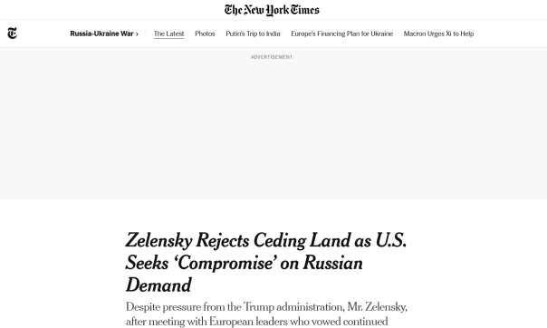 Так, The Telegraph отмечает, что «мирный план Дональда Трампа оказался на грани срыва» после того, как Владимир Зеленский заявил, что «Украина не обязана уступать России территории».