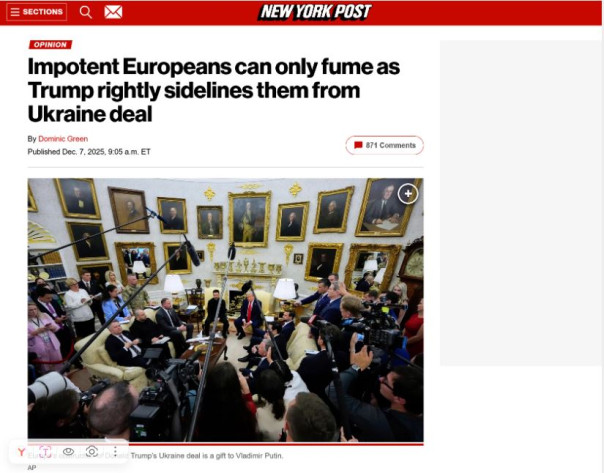 «Бессильные европейцы могут только злиться, в то время как Трамп справедливо отстраняет их от сделки по Украине», — гласит заголовок.