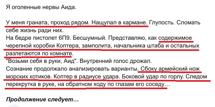 И вот в своих многочисленных бложиках (действующим военнослужащим ВС РФ запрещено вести блоги, но когда это психов останавливало?) он бурно фантазирует о том, какой он супергерой и лично ножом зарезал свыше четырёхсот укропов.
