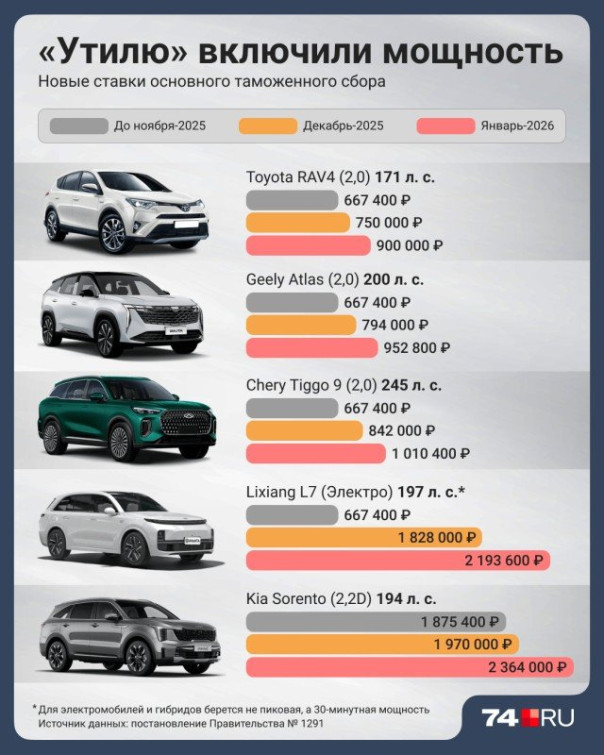 В декабре утильсбор вырос для автомобилей с ДВС мощнее 160 л. с. (для электромобилей — 80 л. с.). При их ввозе частными лицами теперь действуют высокие коммерческие ставки. Для гибридов типа Lixiang L7 это увеличивает цену на 1–1,5 миллиона рублей.
