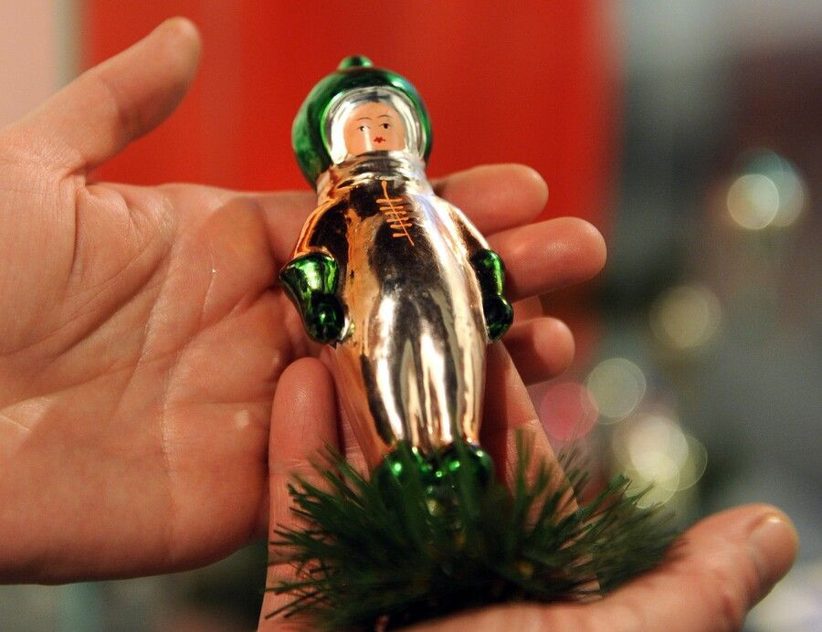Неудивительно, что после 1957 года появились шарики в виде спутников с надписью «СССР», затем картонажные игрушки с изображением собаки Лайки. А с 1961 года фабрика «Ёлочка» и другие стали массово выпускать стеклянных космонавтов и игрушечные «Востоки» и «Союзы» с надписью «СССР». Решетниковская фабрика выпускала бусы «Караван ракет».