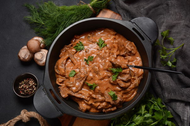 Согласно одной из версий, блюдо изобрели для «открытого стола» Строганова в Одессе, за которым мог отобедать любой прилично одетый горожанин. Новый способ приготовления говядины был удобен для порционной подачи. В дальнейшем блюдо стали называть «бефстроганов». Оно вошло в номенклатуру международной ресторанной кухни как часть российской кулинарной традиции.