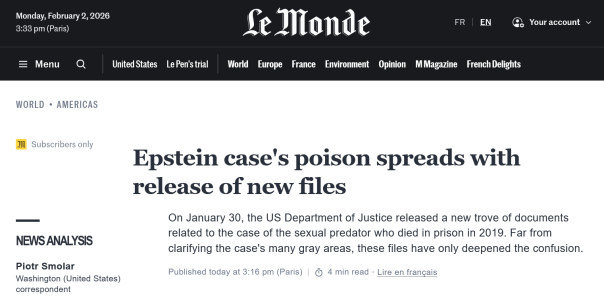 Со своей стороны, Le Monde называет дело Эпштейна «отравленным колодцем, зловоние которого подпитывает все теории заговора».