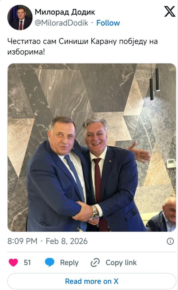 Додик опубликовал фотографию с Караном в своем аккаунте в социальных сетях, написав, что поздравляет его с победой на нынешних выборах. «Победа еще более убедительна», – сказал лидер боснийских сербов на пресс-конференции. Он напомнил, что на прошлых выборах перевес составил 9.577 голосов, «а сегодня – более 10 360. Благодарим наших активистов, граждан, так и муниципалитеты».