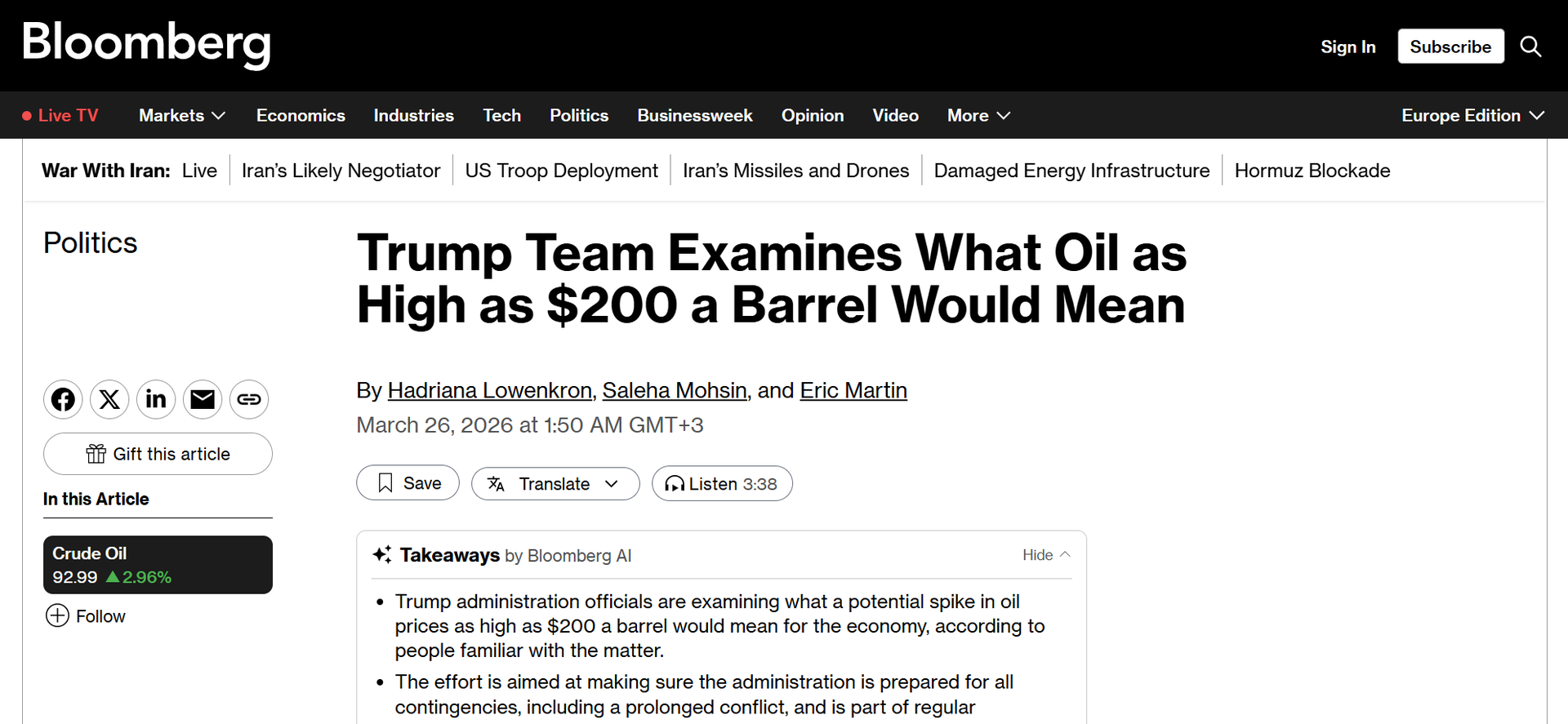 «Команда Трампа изучает, что будет означать подорожание нефти до $200 за баррель», — гласит заголовок.
