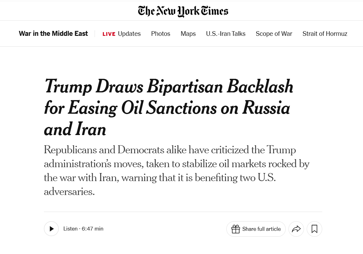Стремясь стабилизировать рынки, администрация США навлекла на себя критику со стороны обеих партий в конгрессе США тем, что временно ослабила санкции против России и Ирана, передаёт The New York Times (NYT).