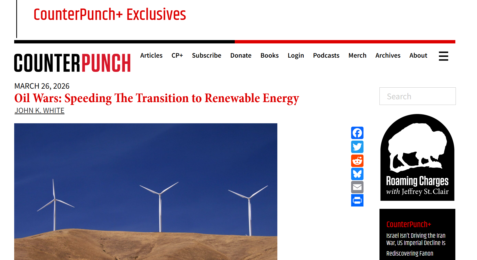 По прогнозам Уайта, теперь всё больше стран будут задумываться об ускорении перехода к возобновляемым источникам энергии как к единственной альтернативе конфликтам, связанным с нефтью.