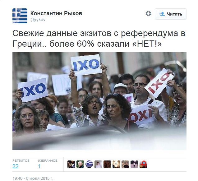 Англоговорящие могут сразу читать Zerohedge, где я и увидел эту новость - http://www.zerohedge.com/news/2015-07-05/economist-calls-victory-no-camp-sees-60-voting-oxi ну и заодно прочитать базовый прогноз EIU от 29 июня - http://country.eiu.com/article.aspx?articleid=613293645&Country=Greece&topic=Politics