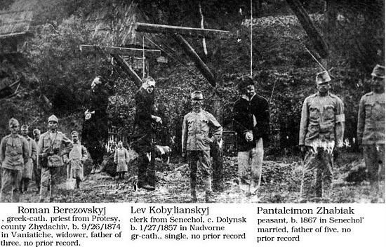Была создана целая сеть концлагерей для русофилов-галичан. (Самый известный из них —Талергоф, близ города Грац в Австрии). В первое время было уничтожено более 60 тыс. человек, более 100 тыс. бежали в Россию, еще около 80 тыс. было убито после первого отступления русской армии, в том числе около 300 униатских священников, заподозренных в симпатиях к Православию и России. Талергоф — это первый концлагерь в Европе, где произошел геноцид русских галичан. Немцам идея понравилась и потом это переросло в Холокост еврейского народа. Холокост — слово греческое и оно в переводе означает «все-сожжение» (у слов есть свой смысл), это уничтожение всех носителей определенной этнической идентичности. Австро-Венгрия в буквальном смысле выжигала все русское в галичанах, это и был «русский холокост», естественно с помощью «украинофилов Галичины». Но, грош цена тому русскому, который называет всех «западенцев» «бандеровцами», это все равно, что называть всех русских «власовцами». Вот фотография настоящих русских, повешенных в Талергофе — ОНИ ГАЛИЧАНЕ. И они во 100 раз больше русские чем жители Брянска или Твери, потому что в этих городах быть русским было легко.