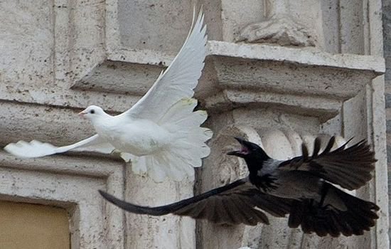 В качестве фонового рисунка использована фотография события, произошедшего 26 января 2014 года. Тогда Папа Римский помолился за мир на Украине, а потом вместе с детьми выпустил в небо двух белых голубей, символизирующих примирение на этой многострадальной земле. На одного голубя тут же напал ворон, изрядно потрепав птицу, которая все же смогла улететь, эта фотография облетела весь мир. Есть такая фраза «народы — это мысли Бога», можно только добавить, что с момента появления понятия нация, за последние 300 лет этот черный ворон убил самое большое количество людей в мировой истории. Народ, это общая память, и это касается не только общих побед, но и общих бед.